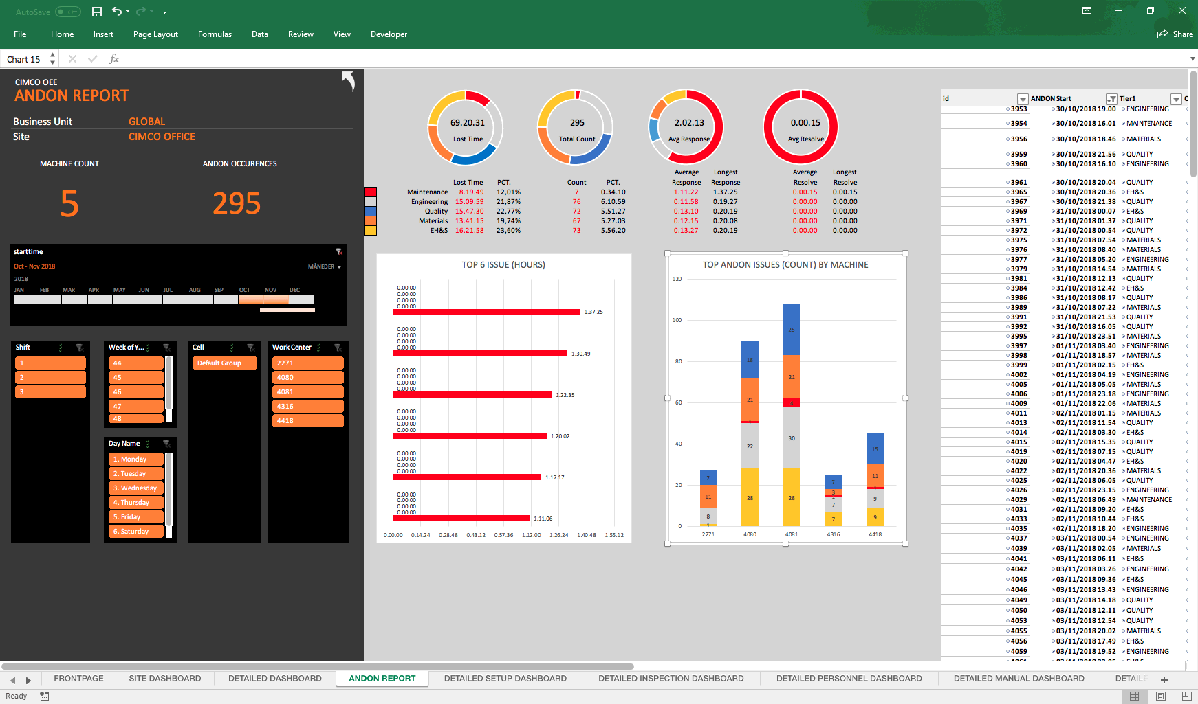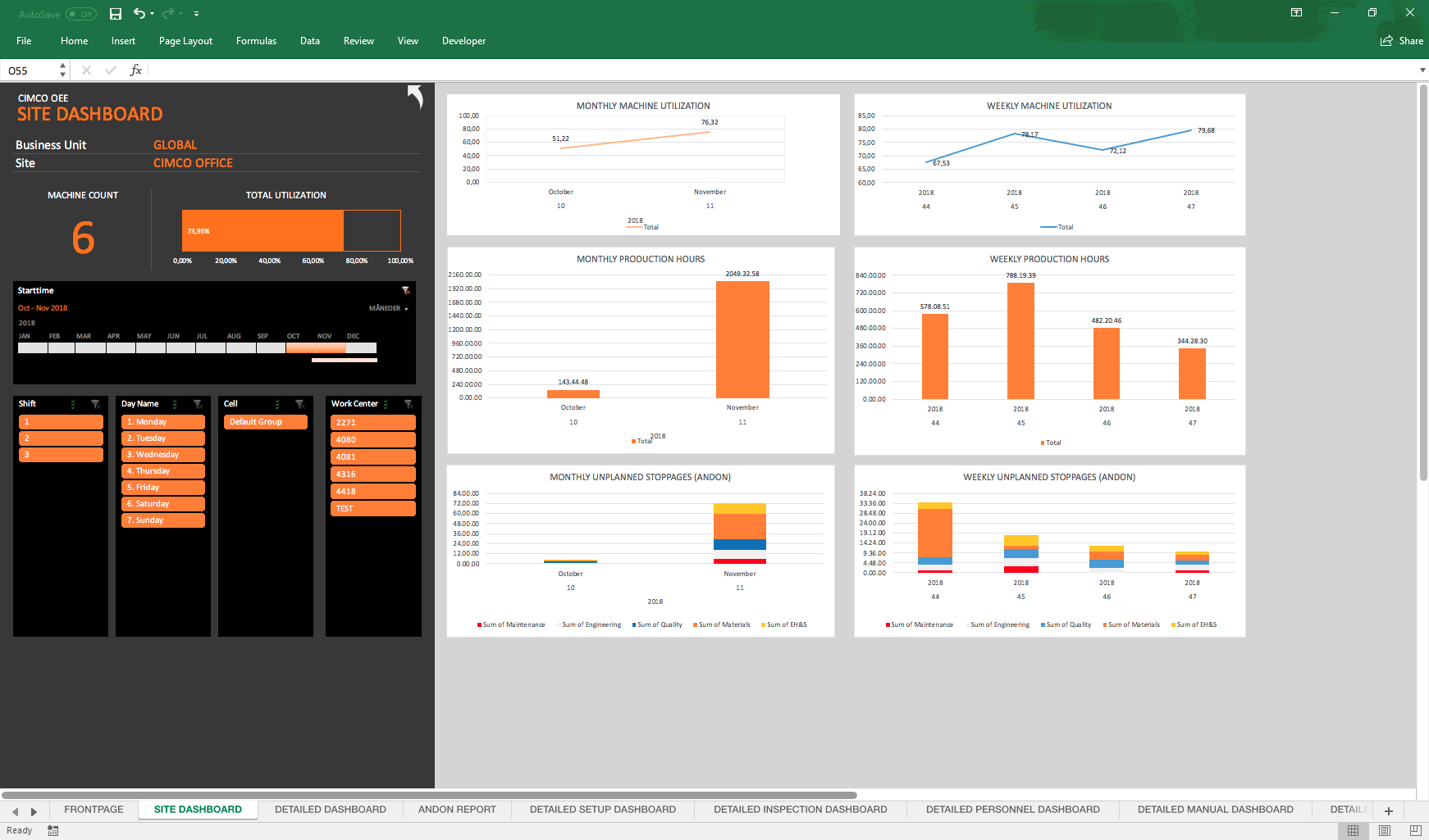 Generate reports and charts with automatic calculation of OEE, cycle time, idle time, setup time, downtime